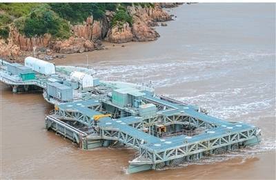 r浙江省舟山市岱山县秀山岛海域,潮涨潮落,风光秀丽。空中俯瞰,形似“小提琴”的发电站总成平台映入眼帘,湍急的潮流穿过涡轮机组,将动能转化为电能。