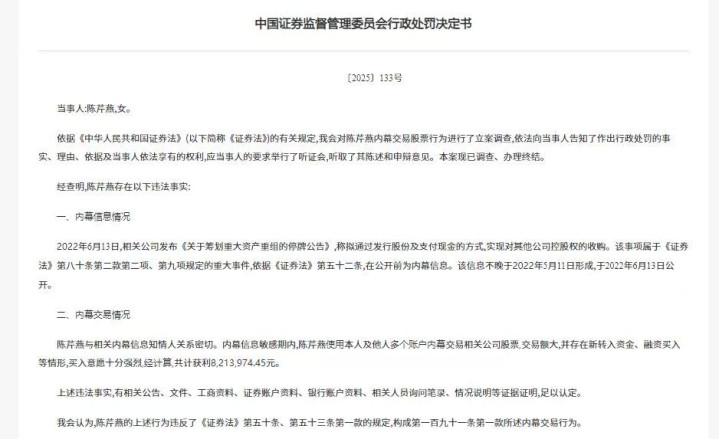 其中,陈芹燕存在以下违法事实:经查明,2022年6月13日,相关公司发布《关于筹划重大资产重组的停牌公告》,称拟通过发行股份及支付现金的方式,实现对其他公司控股权的收购。陈芹燕与相关内幕信息知情人关系密切。内幕信息敏感期内,陈芹燕使用本人及他人多个账户内幕交易相关公司股票,交易额大,并存在新转入资金、融资买入等情形,买入意愿十分强烈,经计算,共计获利821.4万元。