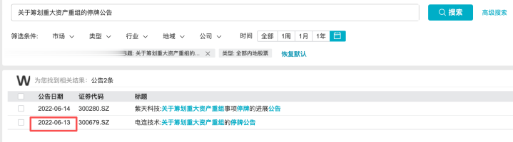 记者查询发现,根据Wind和巨潮资讯信息,2022年6月13日当日,市场仅有电连技术(300679.SZ)发布《关于筹划重大资产重组的停牌公告》。