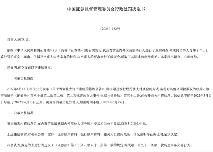 另一当事人黄克的内幕交易问题,同样涉及2022年6月13日相关公司发布的《关于筹划重大资产重组的停牌公告》。