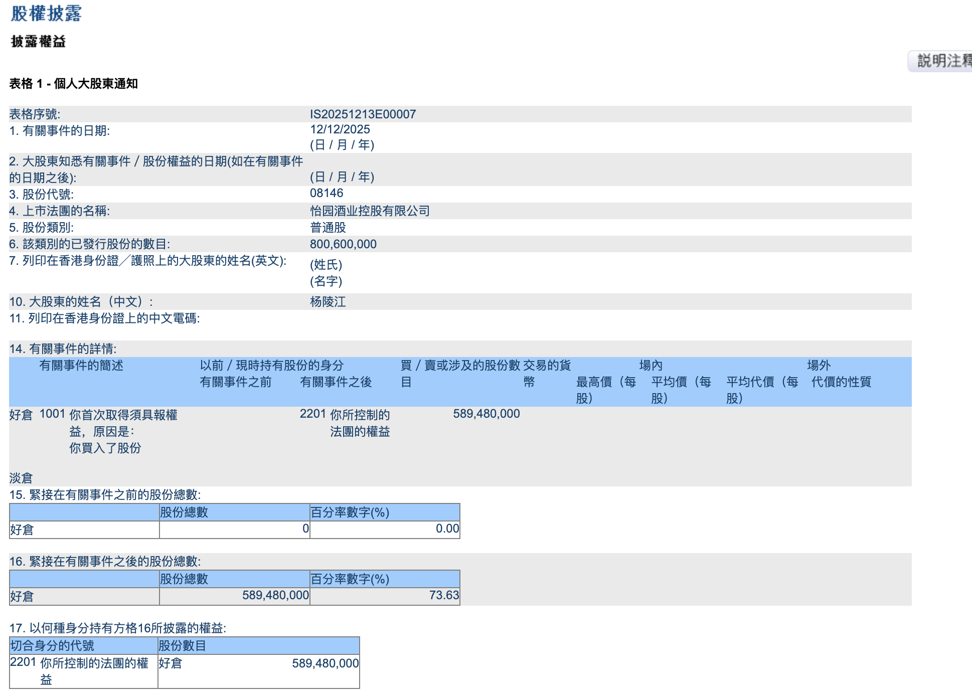 南都湾财社记者注意到,刘运强、熊霞、赵明君以及赵国东均是来自酒类连锁公司壹玖壹玖集团(以下简称“1919”)。2025年12月12日,港交所官网披露,1919实际控制人杨陵江成为怡园酒业大股东,持股比例达73.63%。