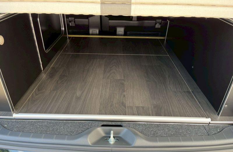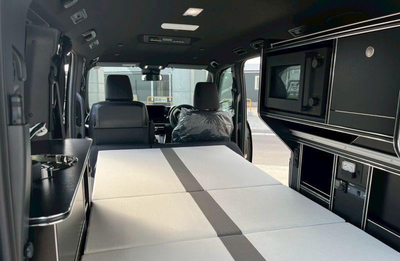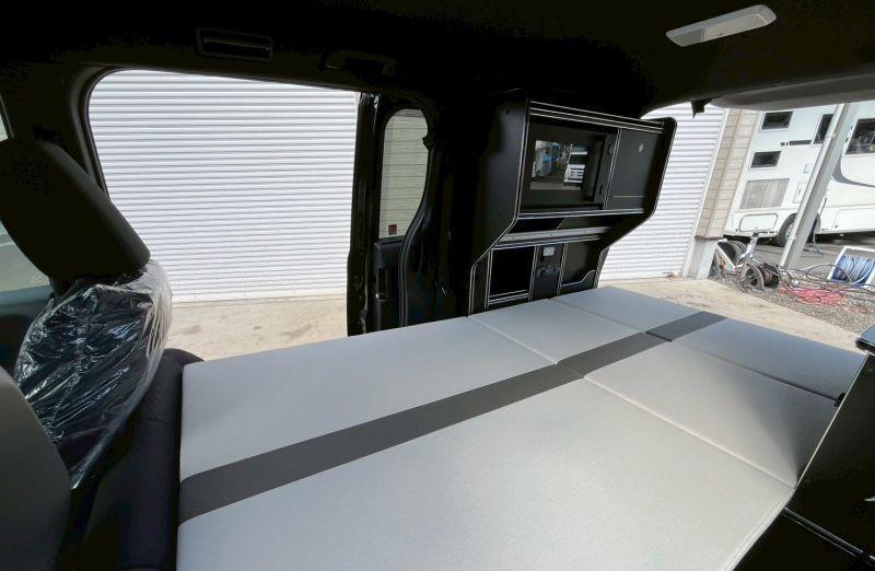 来到车内,第二排座椅为三人联排座,可以调整翻折,全车5座,座椅后部是活动空间,放置了床板和活动餐桌。