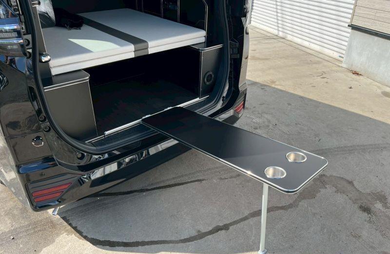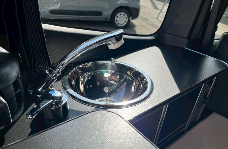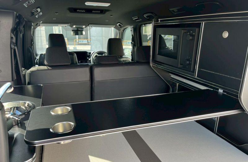 车内生活设施也有一些,座椅后部的空间两侧设置了橱柜,不锈钢台盆和抽拉式花洒,另一侧的柜子上有微波炉以及其他设备,小桌子也可以拿到户外,搭在车尾的轨道上,方便露营使用。